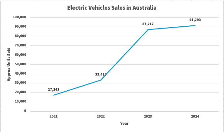 In 2024, sales pushed past 114,000 (PHEV + EV combined sales), accounting for nearly 10% of all new vehicles sold in Australia.